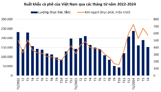 Tính đến hết tháng 4, Việt Nam đã xuất khẩu 65-70% sản lượng của niên vụ 2023-2024. Mặc dù vậy, giá cà phê trong nước đã bất ngờ đảo chiều và giảm 25% so với mức đỉnh đạt được vào cuối tháng 4, xuống quanh mốc 100.000 đồng/kg.