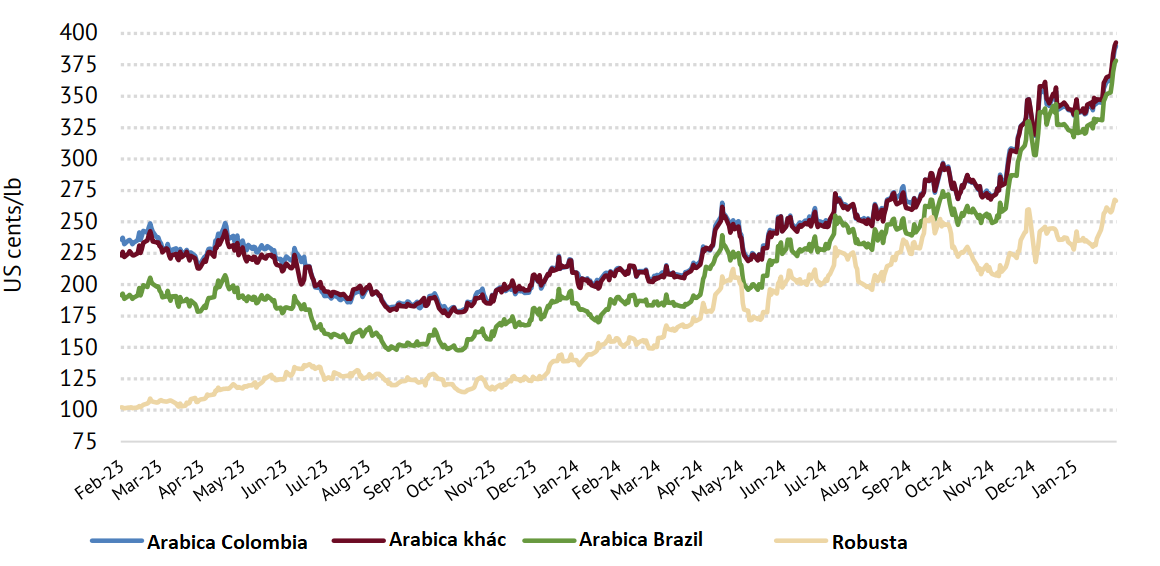 Theo Tổ chức Cà phê Quốc tế (ICO), giá cà phê thế giới đã tăng lên mức cao nhất trong 48 năm qua. Trong khi đó, xuất khẩu cà phê toàn cầu sụt giảm nhẹ trong ba tháng đầu tiên của niên vụ 2024-2025.