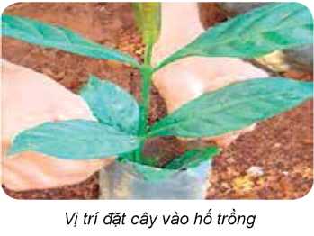 Khuyến cáo việc xử lý túi bầu sau khi trồng. Xới tơi đất ở độ sâu 50 cm. Đào hố sâu 25 - 30 cm ở giữa hố trồng cà phê. Cắt đáy bầu 1 cm X tối đa 3 cm, xé túi bầu và đặt bầu vào hố (mặt bầu thấp hơn mặt đất tự nhiên khoảng 10 cm); lấp đất và lèn nhẹ xung quanh bầu.