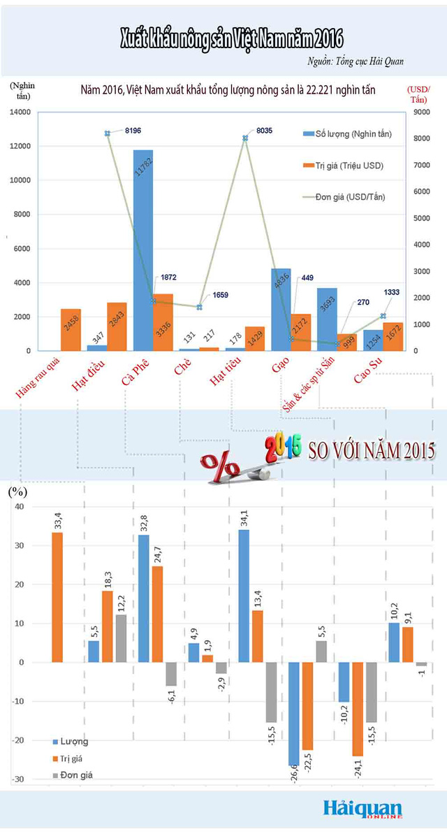 Trị giá xuất khẩu nhóm hàng nông sản trong năm 2016 đạt hơn 15 tỷ USD, tăng 7,7% so với năm trước và chỉ nhỉnh hơn 252 triệu USD so với kim ngạch xuất khẩu năm 2012.
