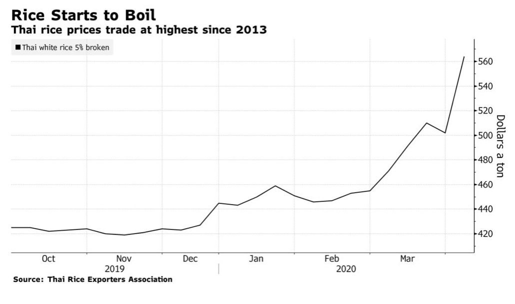 Là một tiêu chuẩn cho hoạt động xuất khẩu gạo của châu Á, giá gạo trắng 5% tấm của Thái Lan đã tăng hơn 25% trong năm nay lên 564 USD/tấn hôm 1/4, đây là mức cao nhất kể từ năm 2013. Nguyên nhân giá loại gạo này tăng mạnh như vậy là do hạn hán và nhu cầu tăng từ các nước nhập khẩu.