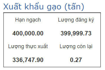 Thời điểm trước khi ngừng cập nhật thông tin số lượng đăng kí xuất khẩu gạo theo hạn ngạch tháng 4/2020, lượng gạo các doanh nghiệp đã xuất khẩu là hơn 336.747 tấn, tương đương hơn 84% tổng lượng gạo trong hạn ngạch 400.000 tấn.