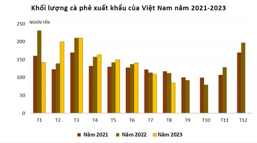 Khối lượng cà phê xuất khẩu của Việt Nam trong tháng 8 đã giảm xuống mức thấp nhất kể từ tháng 11/2022 do nguồn cung không còn nhiều. Tuy nhiên, giá xuất khẩu mặt hàng này đã tăng lên mức kỷ lục mới là 3.054 USD/tấn, cao hơn gần 700 USD/tấn so với cùng kỳ năm ngoái.